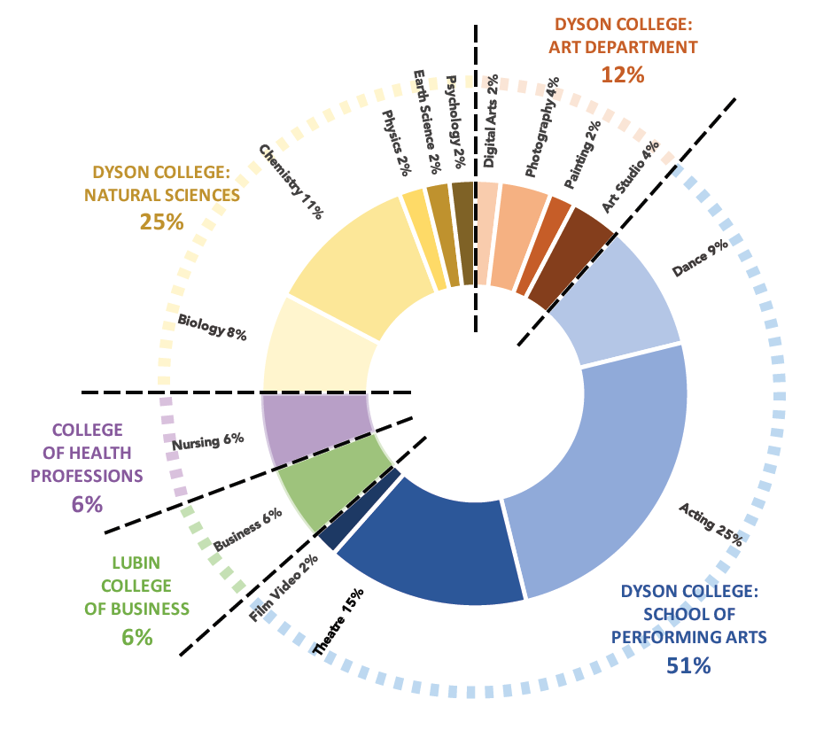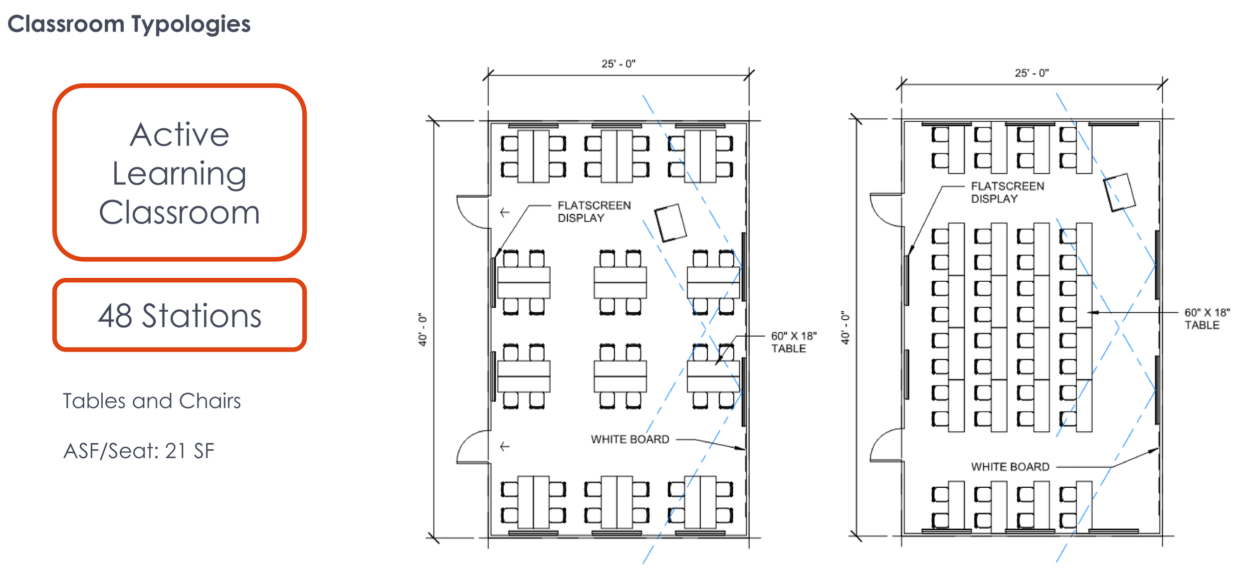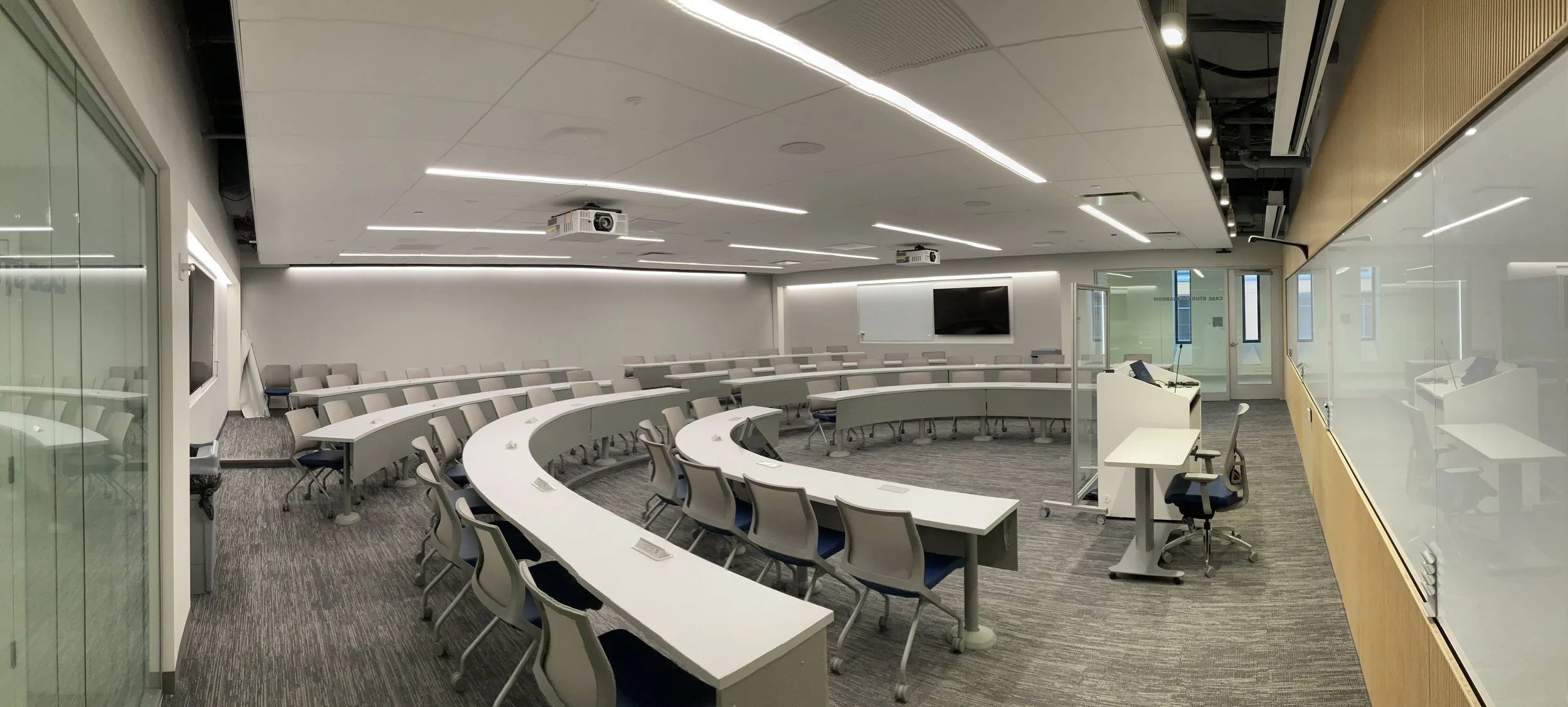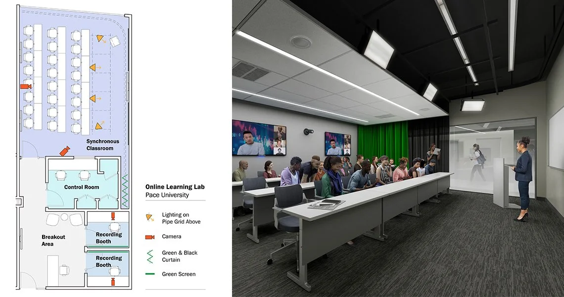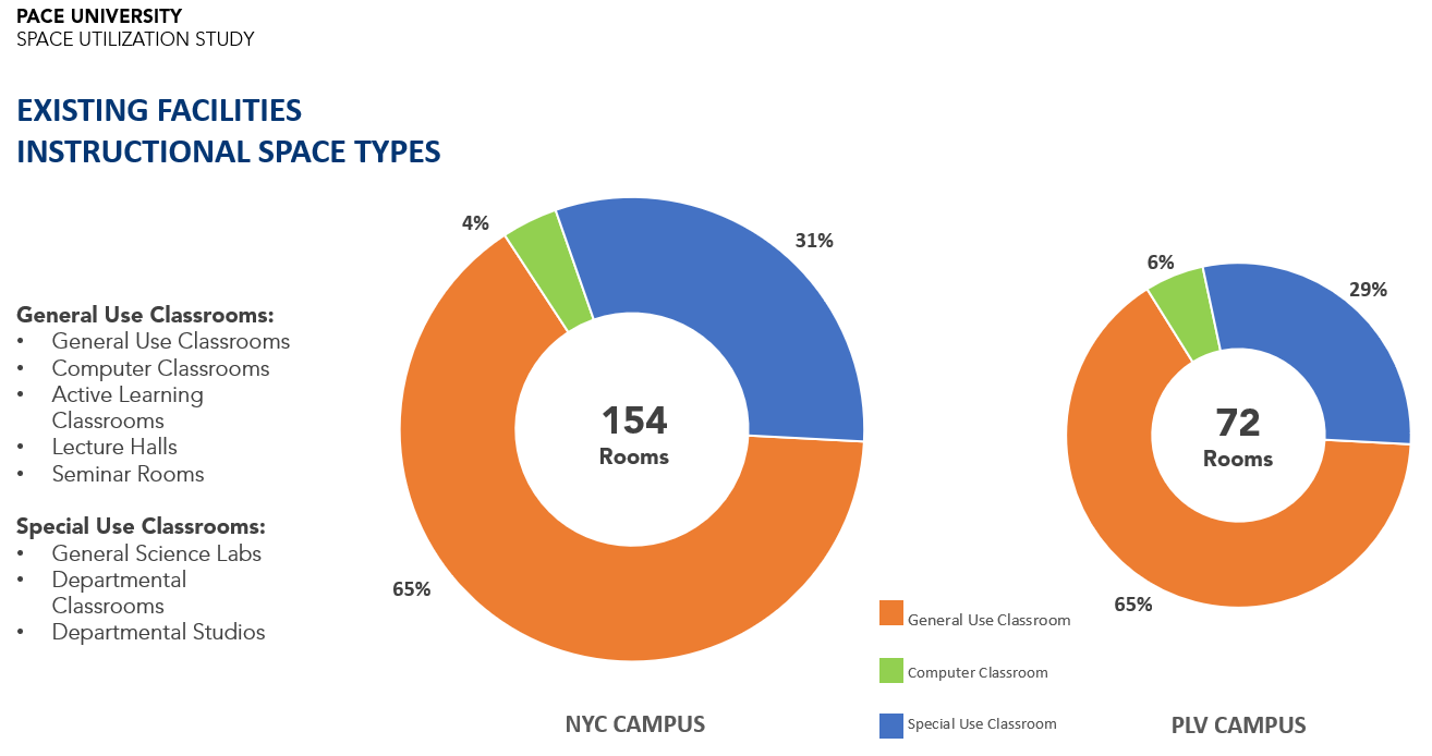 This project is the result of a long partnership with Pace University, starting with a Space Utilization Study in Fall 2017. This study took a detailed look at how Pace uses their instructional spaces, how scheduling practices might be optimized and right-sizing seat layouts with code requirements and code minimums.