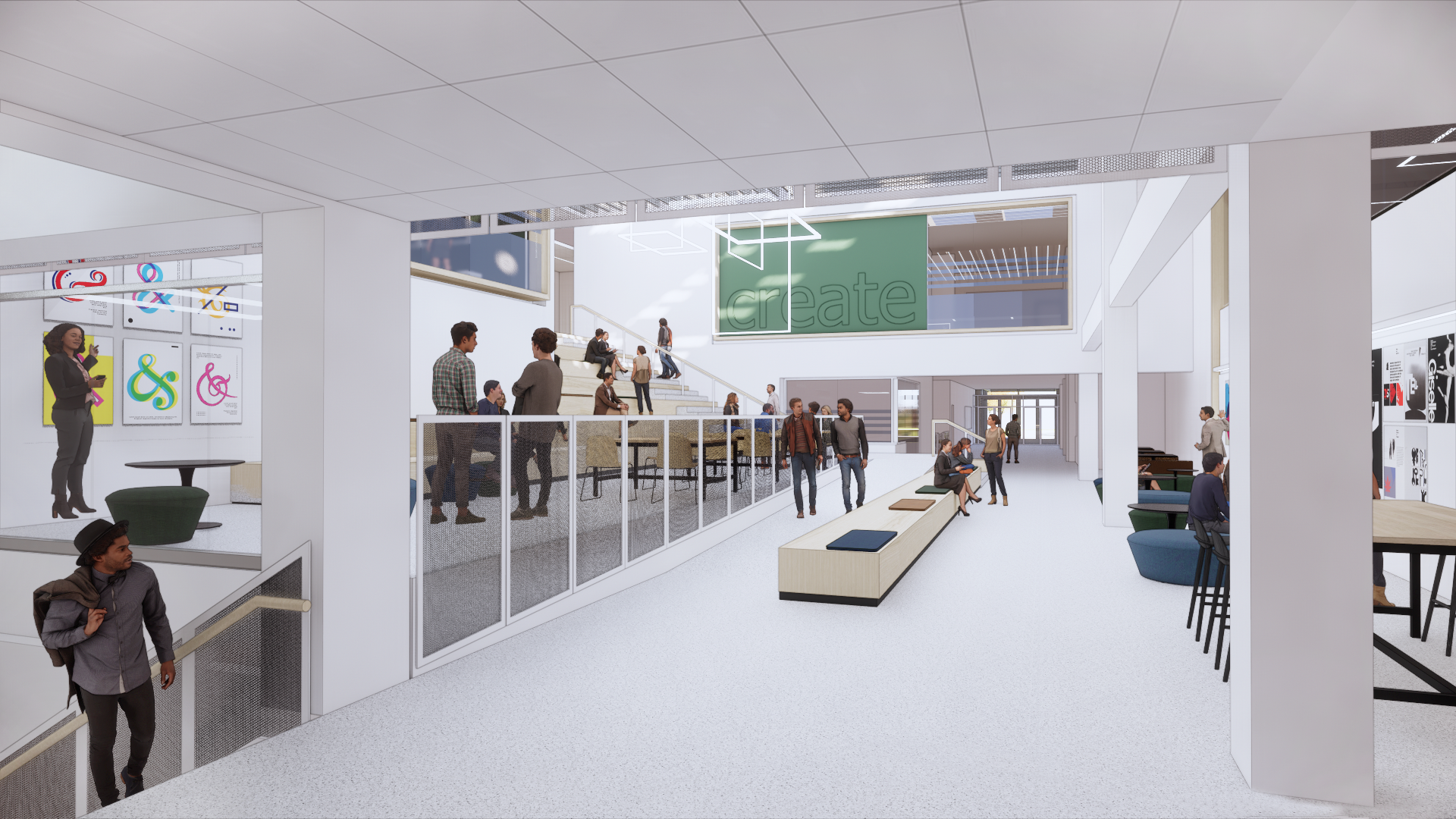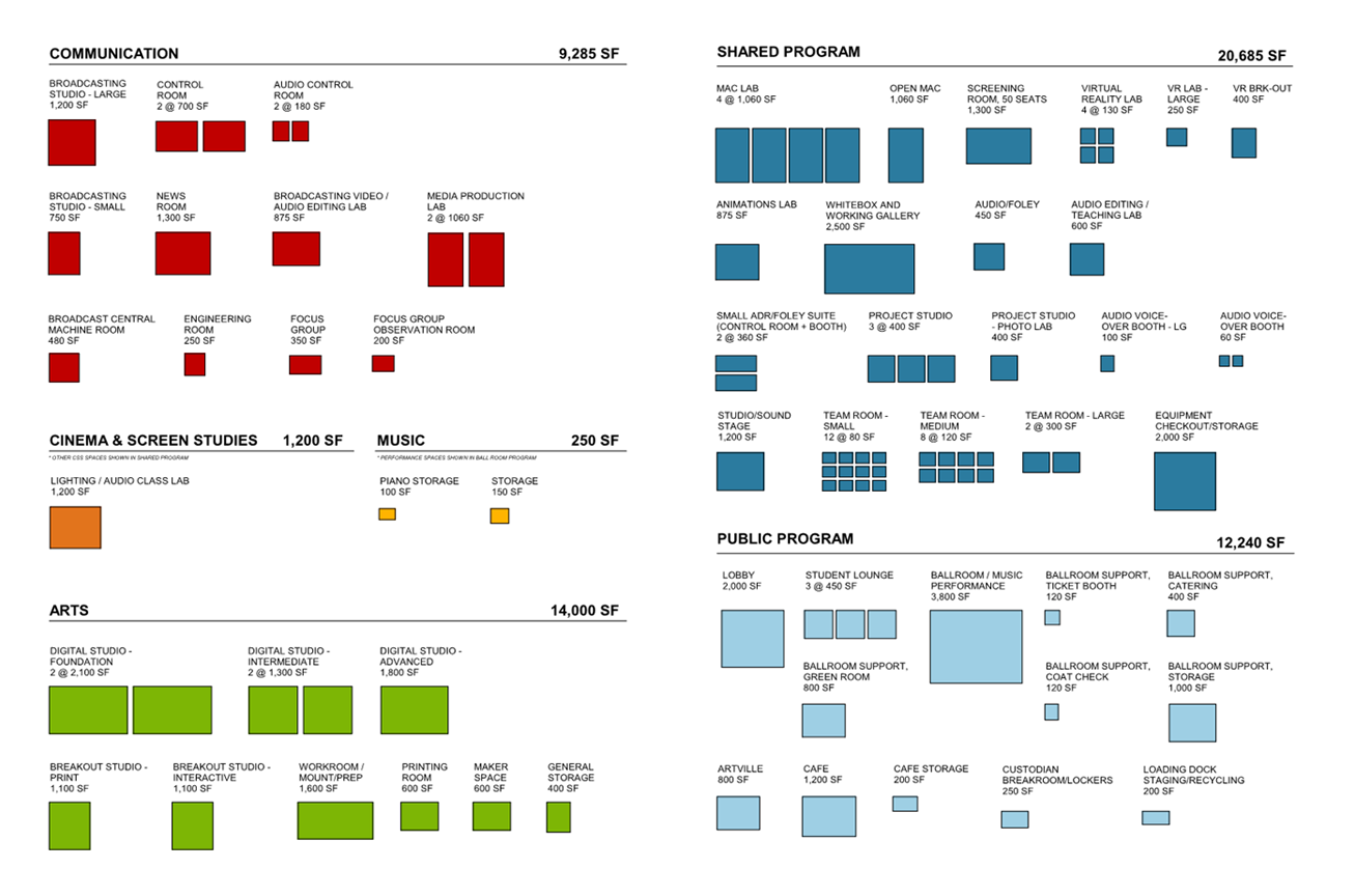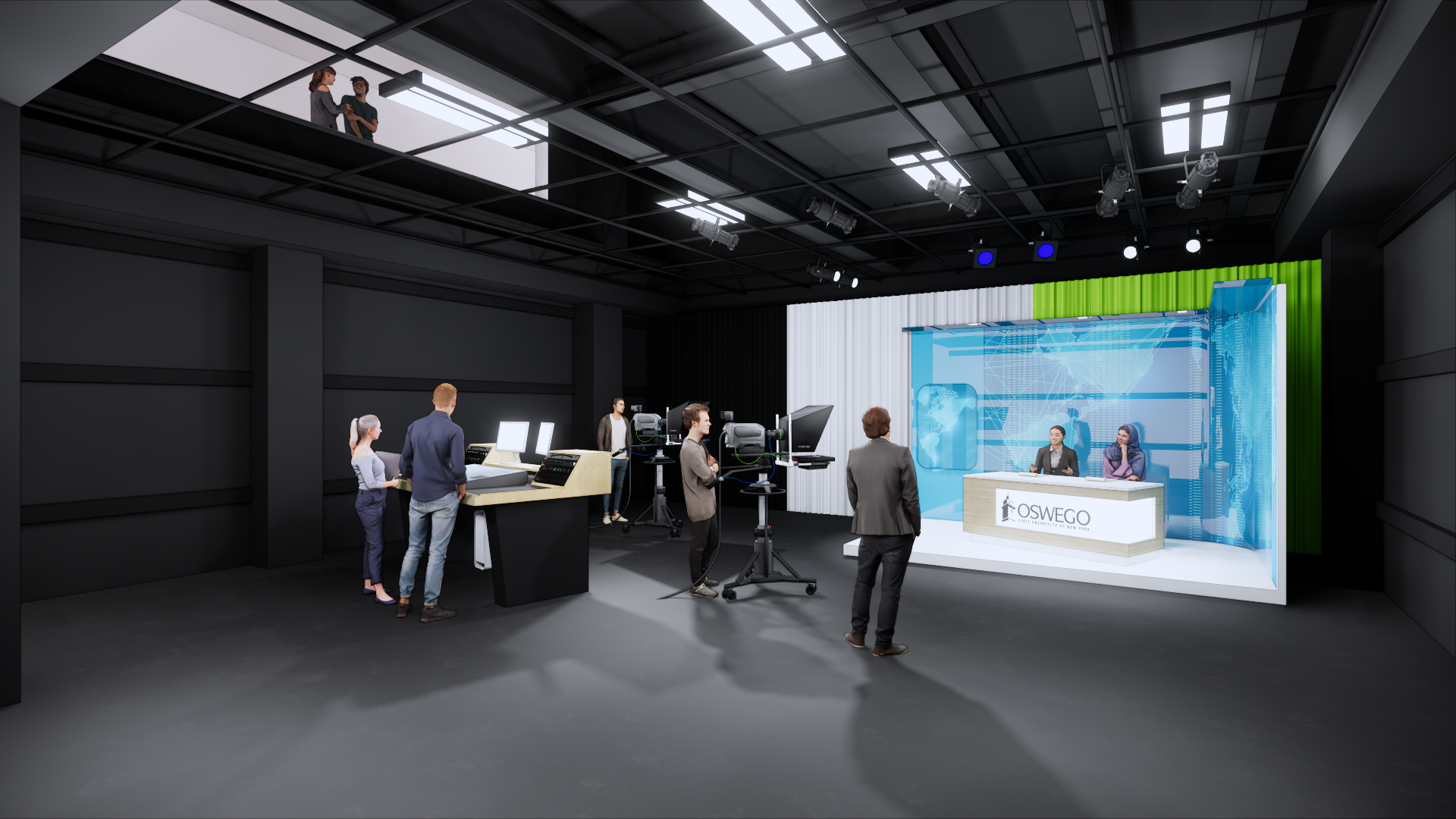 The existing Hewitt Hall on SUNY Oswego’s campus spent many years as a concrete-encased hub for student services before the campus decided to turn the outdated building into a state-of-the-art facility to house the School of Communication & Media Arts. Our team completed a study of the course schedule and lively visioning sessions with the departments to determine appropriate program pieces to fit into this new campus hub. The result is a programmatic organization that leverages shared space, makes the best use of existing architecture, and allows for strategic collaborative openings in the center of the deep floor plate. The technical spaces came into focus through repeated user meetings with all departments, gaining consensus through simple and info-packed graphic representations of the spaces.